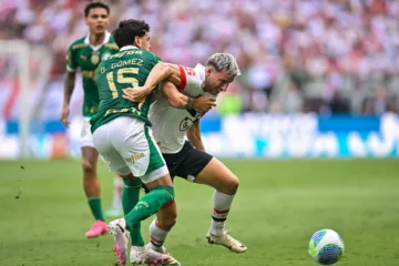 Os jogadores Gustavo Gómez e Calleri em disputa da bola durante Palmeiras x SPFC na Supercopa. (Crédito: Pedro Vilela/Getty Images)