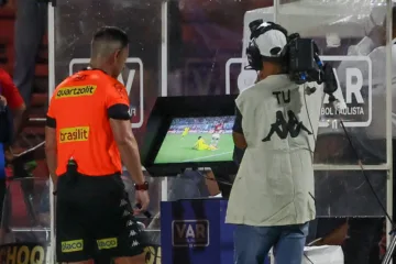 Árbitro revê lance que gerou expulsão da Portuguesa contra o Palmeiras no Paulistão. (Créditos: Fabio Menotti/Palmeiras/by Canon)