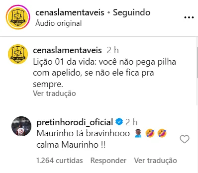 “Maurinho tá bravinhooo 🤦🏾‍♂️🤣🤣 Calma, Maurinho!!”, escreveu Rodinei, em post no Instagram.