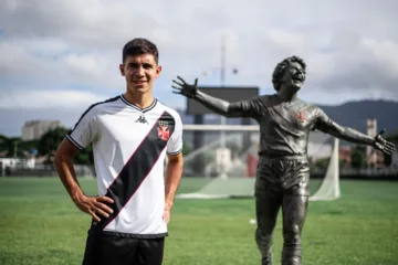 Sforza posa com a estátua de Roberto Dinamite, ídolo eterno do Vasco (Leandro Amorim/Vasco)