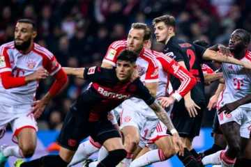 Kane, do Bayern de Munique, briga com a defesa do Bayer Leverkusen no jogo válido pela Bundesliga (Reprodução/X/Bayer Leverkusen)
