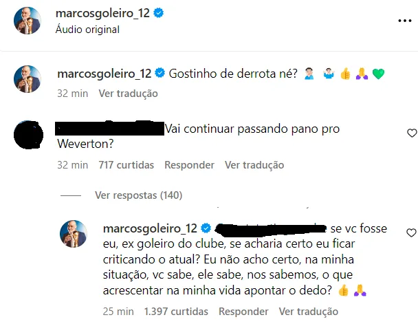 “Se você fosse eu, ex goleiro do clube, se acharia certo eu ficar criticando o atual? Eu não acho certo, na minha situação, você sabe, ele sabe, nós sabemos, o que acrescentar na minha vida apontar o dedo?”, respondeu Marcos.