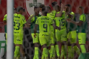 Jogadores do Palmeiras celebram gol contra a Portuguesa (Cesar Greco - Ag. Palmeiras - Divulgação)