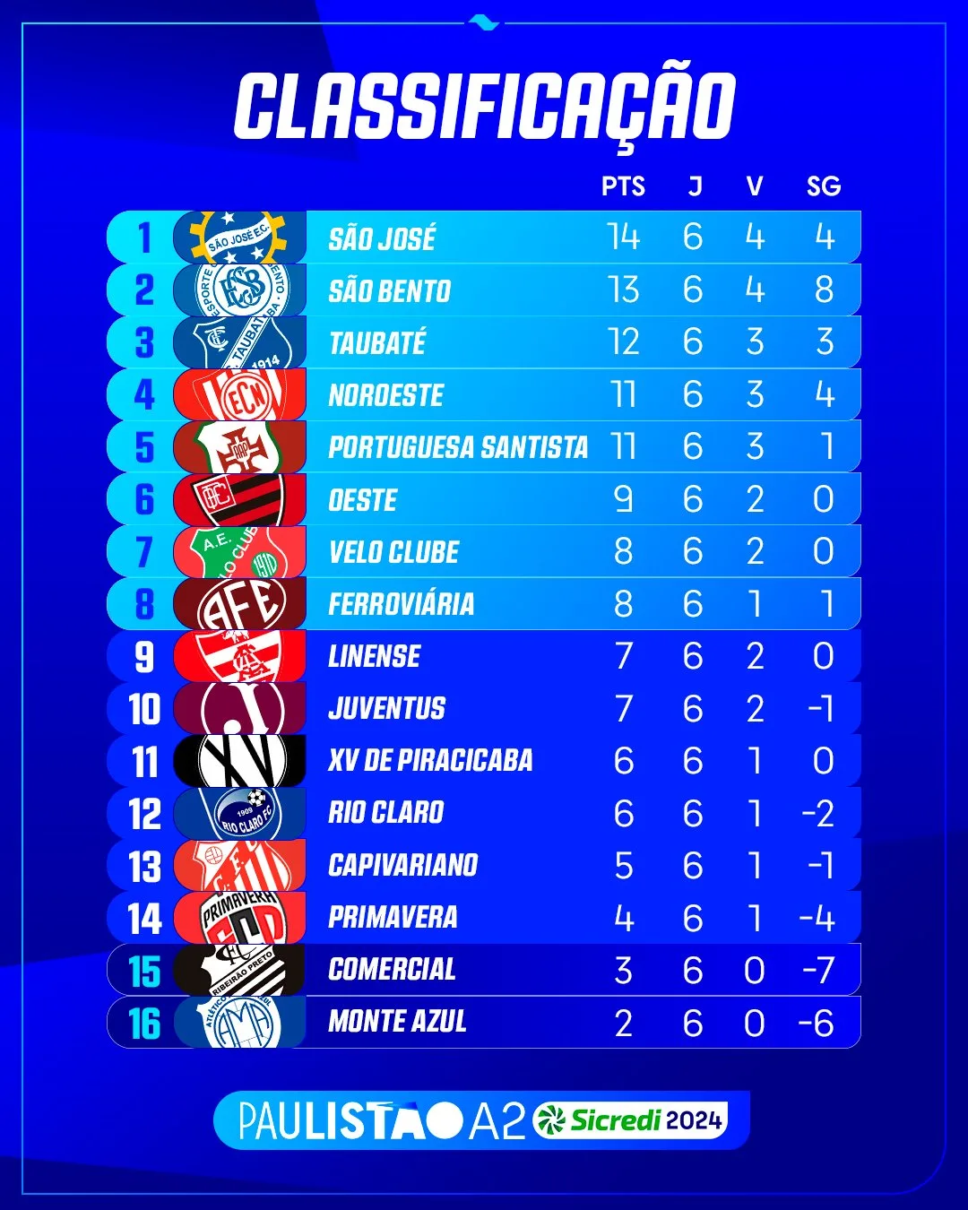 Depois de seis rodadas do Paulistão A2 apenas três equipes seguem invictas na competição. O São José manteve sua liderança ao empatar fora de casa com XV de Piracicaba. Já o Taubaté assumiu a 3ª colocação ao vencer o Linense em Lins. O terceiro time que ainda não foi derrotado é a Ferroviária, que assumiu a 8ª posição ao empatar com o Velo Clube.