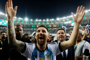 Messi vibra com torcedores da Argentina após vitória sobre o Brasil nas Eliminatórias para a Copa do Mundo 2026. ( Wagner Meier/Getty Images)