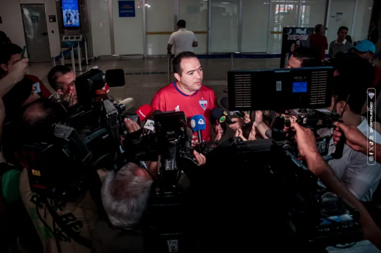 Marcelo Paz, CEO do Fortaleza, concede entrevista no desembarque do time na capital cearense sobre ataque ao ônibus da comitiva (Mateus Lotif/FEC)