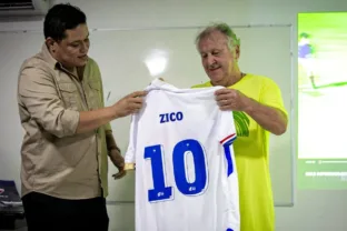 Zico recebe camisa personalizada de dirigente do Fortaleza (João Moura/Fortaleza)