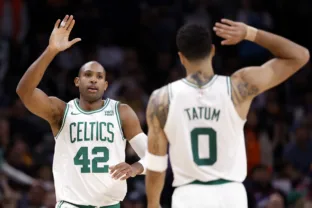 Tatum e Al Horford comemora cesta marcada na vitória dos Celtics sobre os Suns (Chris Coduto/Getty Images)
