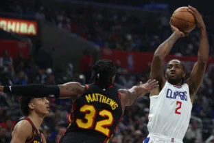 Kawhi Leonard, dos Clippers, encara a marcação dos Hawks, pela temporada regular da NBA (Harry How/Getty Images)