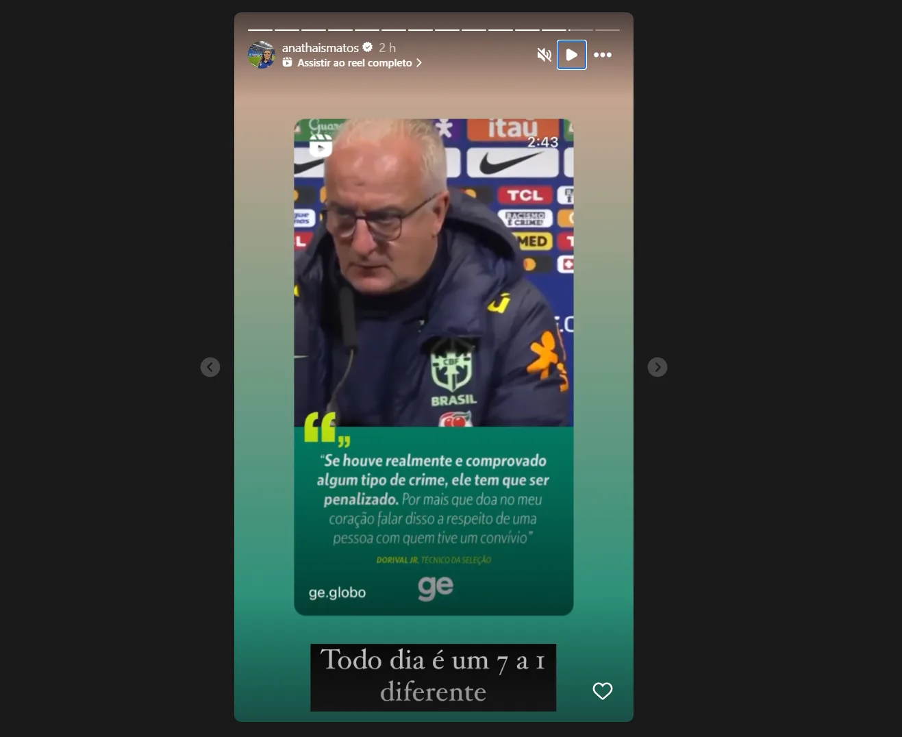 Em outra publicação mais aprofundada, Ana Thaís cobrou reações ligadas à postura de Dorival Júnior. Como as opiniões femininas costumam ser rebatidas nas redes sociais, a jornalista lamentou os ataques constantes sofridos pelas mulheres.