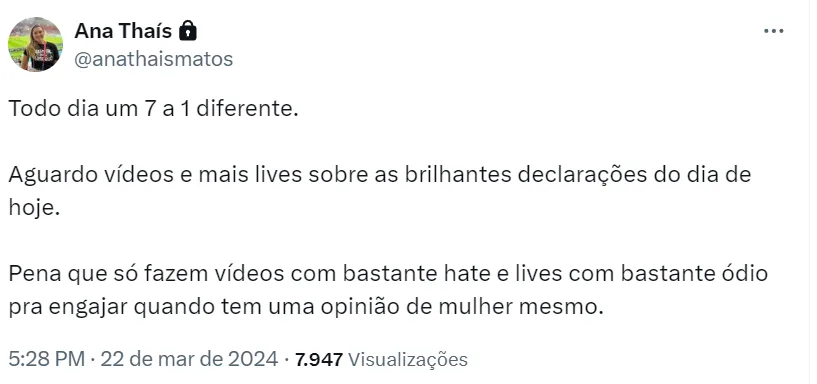 “Todo dia um 7 a 1 diferente. Aguardo vídeos e mais lives sobre as brilhantes declarações do dia de hoje. Pena que só fazem vídeos com bastante hate e lives com bastante ódio pra engajar quando tem uma opinião de mulher mesmo”, afirmou na plataforma X.