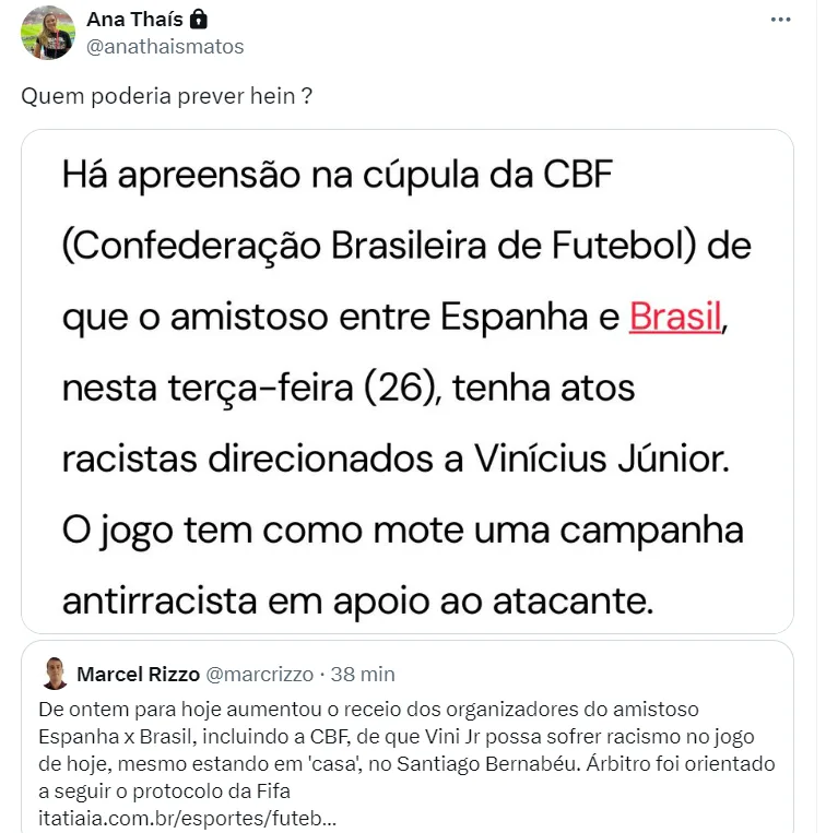 A jornalista reagiu a uma notícia que informa que a Confederação Brasileira de Futebol está com receio do craque do Real Madrid ser vítima de racismo mais uma vez: “Quem poderia prever, hein?”, comentou Ana Thaís nas redes sociais; confira: