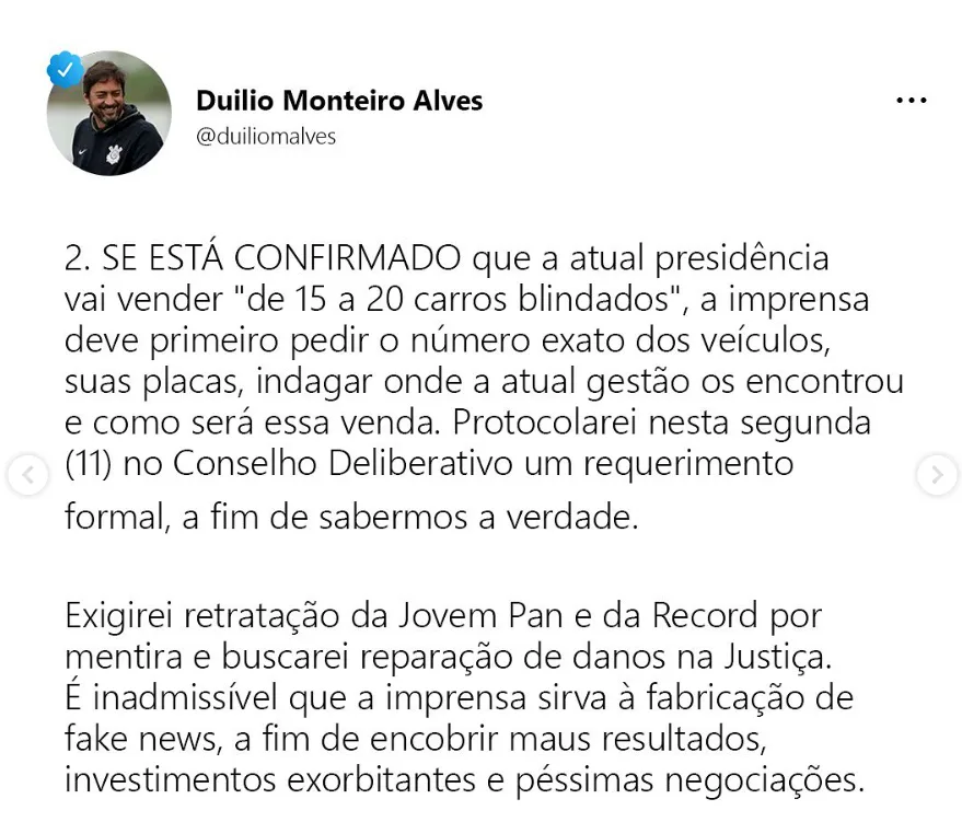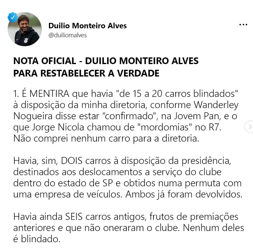 Neste domingo (10), Duilio Monteiro Alves, ex-presidente do Corinthians, se posicionou publicamente em relação a uma suposta alegação de carros blindados que estavam à disposição da diretoria durante sua gestão.