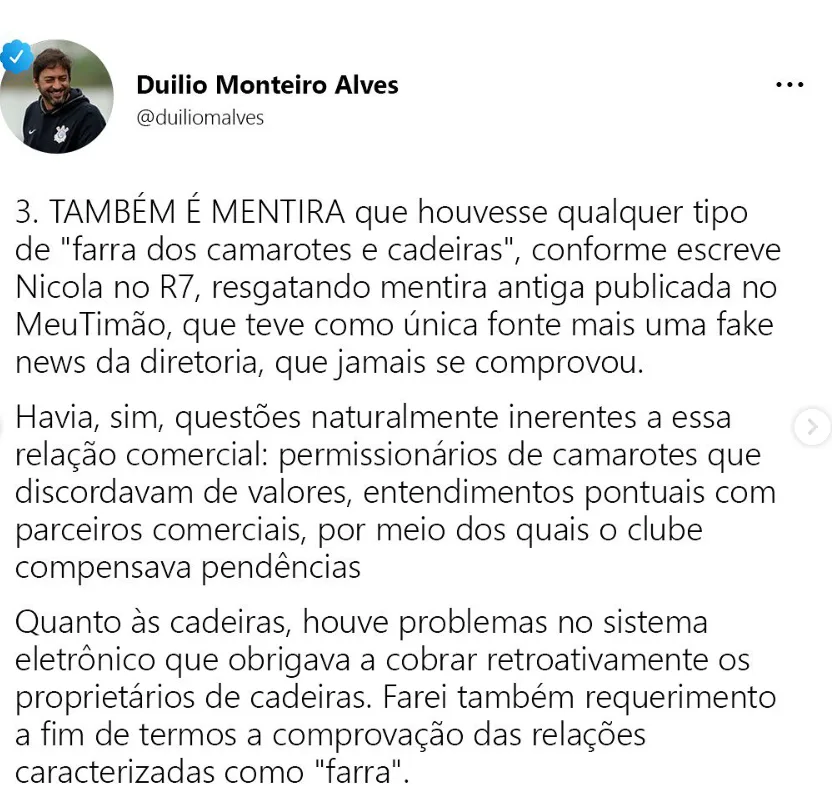 Até o momento dessa postagem a atual gestão do Corinthians não emitiu nenhuma nota em relação as declarações de Duilio Monteiro Alves.