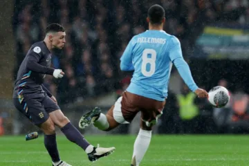 A Inglaterra respondeu em seguida aos 53, quando Bellingham recebeu cruzamento na área e cabeceou errando o alvo, mas dando um susto na defesa adversária.
