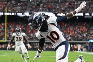 Jerry Jeudy, do Denver Broncos, comemora após um touchdown durante o segundo quarto no jogo contra o Las Vegas Raiders (Candice Ward/Getty Images)