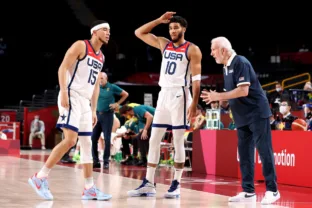 Técnico Popovich fala com Tatum e Booker durante as quartas de final das Olimpíadas de Tóquio, em 2021 (Gregory Shamus/Getty Images)