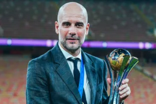Guardiola posa para a foto com o título do Mundial de Clubes, conquistado pelo Manchester City contra o Fluminense no ano passado (Reprodução/X/Manchester City)