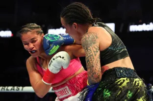 Favorita ao ouro olímico, Beatriz Ferreira golpeia Destiny Jones (Ezra Shaw/Getty Images)
