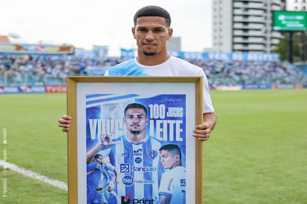 Um dos titulares escalados por Hélio dos Anjos, Vinicius Leite foi homenageado antes da bola rolar. O atacante chegou à marca de 100 partidas pelo Paysandu.