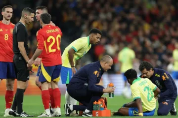 Endrick sendo atendido durante Brasil x Espanha (Rafael Ribeiro / CBF)
