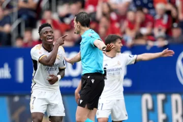Vinícius Júnior reclama com o árbitro de Osasuna x Real Madrid (Juan Manuel Serrano Arce/Getty Images)