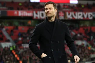 Xabi Alonso, técnico do Bayer Leverkusen, observa antes da partida da Bundesliga conra o Mainz 05 (Alexander Hassenstein/Getty Images)