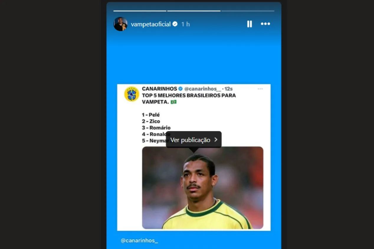 Na árdua missão de apontar os cinco melhores, Vampeta deixou Ronaldinho Gaúcho de fora e colocou Neymar entre grandes nomes do esporte, como Pelé, Zico, Romário e Ronaldo Fenômeno. Nos stories do Instagram, o ex-jogador replicou o post da página “Canarinhos”, onde a opinião dele sobre os melhores é destacada.
