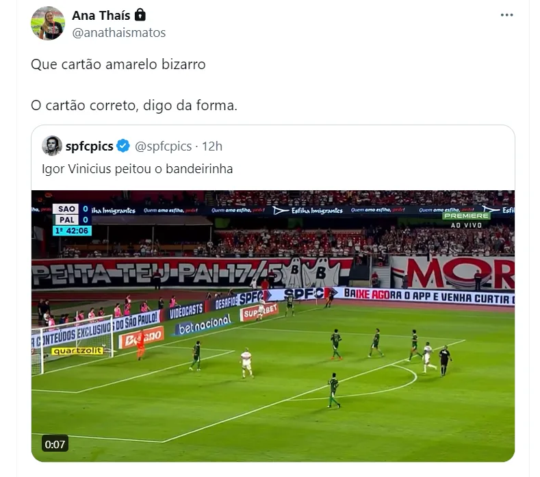 São Paulo e Palmeiras empataram por 0 a 0, em clássico da quarta rodada do Brasileirão 2024, disputado no Morumbis, na noite de ontem (29), e um lance específico chamou a atenção da jornalista Ana Thaís Matos no duelo.