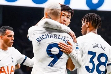Richarlison abraça Son durante jogo do Tottenham (Reprodução/X/Tottenham)