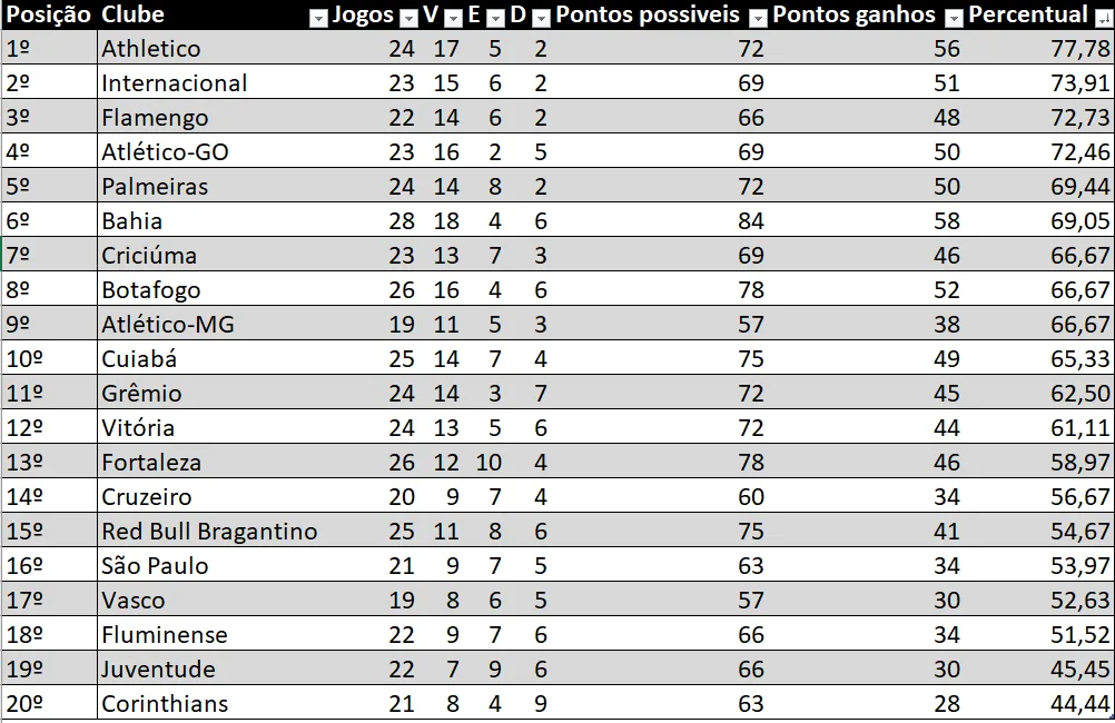 O Athletico hoje possui quase 78% de pontos ganhos no ano, considerando apenas jogos oficiais. O Colorado aparece com o segundo percentual, seguido do Mengão. Fechando o top-5 aparecem Atlético-GO e Palmeiras.