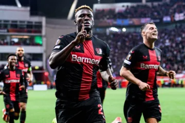 Boniface comemora o gol marcado pelo Leverkusen contra o West Ham na Europa League (Reprodução/X/Bayer Leverkusen)