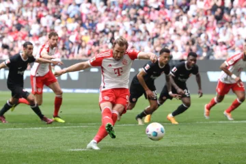 Harry Kane, do Bayern de Munique, marca o segundo gol de sua equipe de pênalti na Bundesliga contra o Eintracht Frankfurt (Alexander Hassenstein/Getty Images)