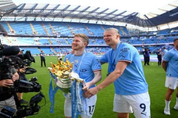 Belga comemora o título inglês ao lado de Erling Haaland (Michael Regan/Getty Images)
