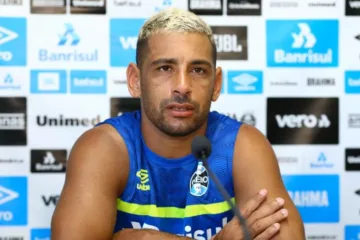 Diego Souza durante coletiva no Grêmio (Lucas Uebel - Divulgação - Grêmio
