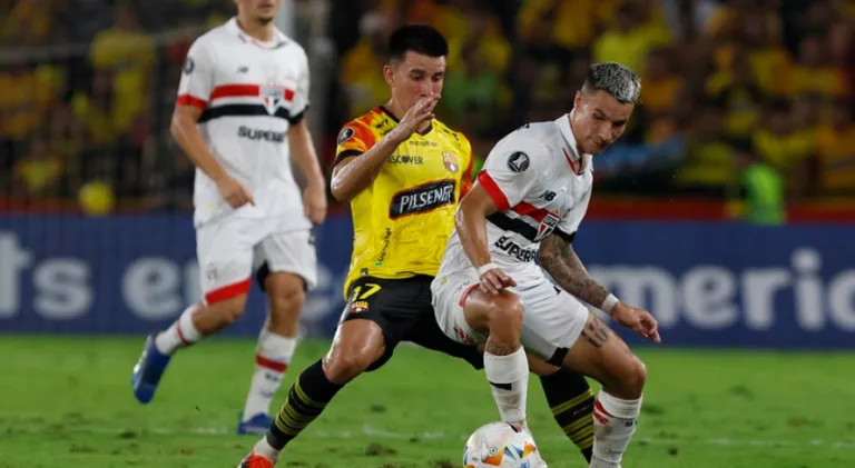 Ferreira em disputa de bola contra o Barcelona do Equador (Créditos: Rubens Chiri/Saopaulofc)