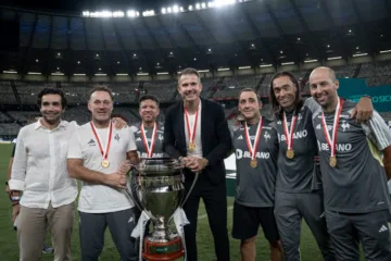 Victor Bagy (centro), segura a taça do campeonato mineiro ao lado do técnico Gabriel Milito (Pedro Souza / Atlético-MG)