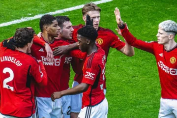 Jogadores do Manchester United comemoram juntos (Reprodução/X/Manchester United)
