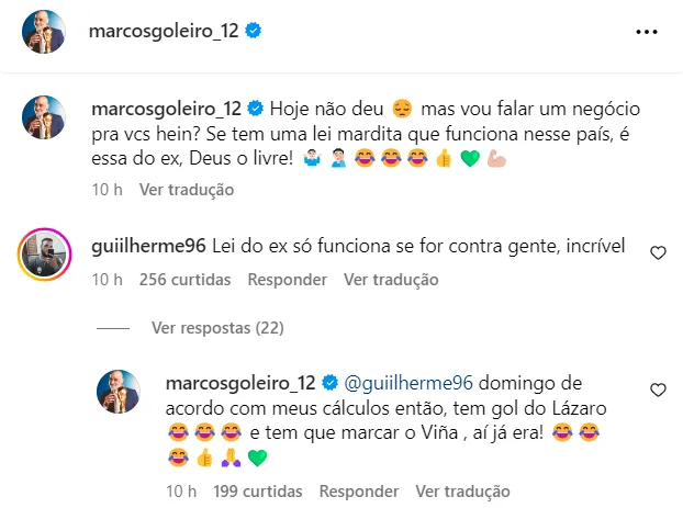 “Hoje não deu, mas vou falar um negócio pra vocês, hein? Se tem uma lei ‘mardita’ que funciona nesse país, é essa do ex, Deus o livre!”, escreveu Marcos, em postagem no Instagram.