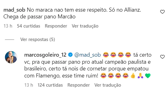 Como o resultado não agradou parte da torcida do Palmeiras, Marcos acabou sendo acusado de “passar pano” para o time de Abel Ferreira. Reagindo ao comentário, o ex-goleiro foi irônico ao destacar os títulos recentes do clube.