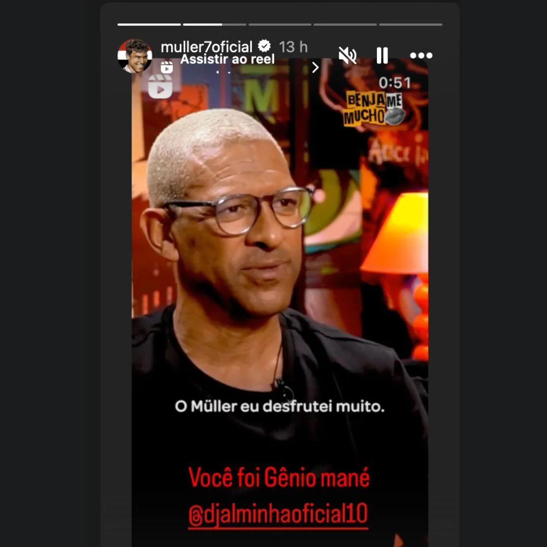 Nome exponencial do futebol nacional, Muller teceu elogios ao ex-meia Djalminha, outro nome que também teve grande destaque durante sua trajetória. Nas redes sociais, ele compartilhou um vídeo de entrevista de Djalma ao podcast “Benja Me Mucho” e na legenda o classificou como “gênio”.