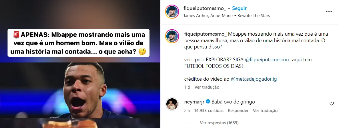 “Mbappé mostrando mais uma vez que é uma pessoa maravilhosa, mas o vilão de uma história mal contada. O que pensa disso?”, publicou-se na página “Fiquei Puto Mesmo“.