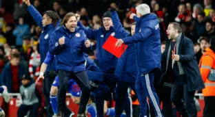 Pedro Martins comemorando gol no comando do Olympiacos (Créditos: Twitter CoachPMartins)