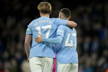 De Bruyne e Foden se abraçam durante jogo do Manchester City (Reprodução/X/Phil Foden)