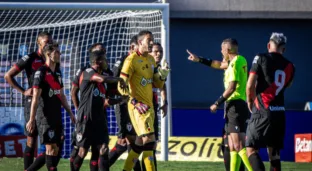 Elenco do Atlético-GO reclamando com árbitro da partida (Créditos: Ingryd Oliveira/ACG)
