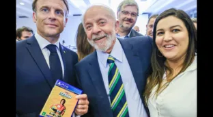 “Rodrigo Terra, presidente da Abragames, e Cecilia Rodrigues, da consultoria E-Relgov, aproveitaram a presença no almoço presidencial entre Brasil e França na sede do Itamaraty para entregar em mãos ao presidente Lula e ao presidente Emmanuel Macron um presente símbolico dos games do nosso país: um jogo digital 100% brasileiro, Horizon Chase Turbo – Senna, da empresa gaúcha Aquiris. A indústria brasileira de jogos digitais é potente, e alcança mais esse espaço.
