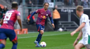 Xavi Simons em campo pelo RB Leipzig contra o Borussia Mönchengladbach ( Teresa Kroeger/RHR-FOTO)