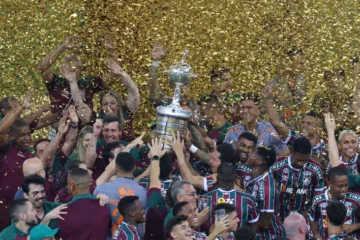 Nino do Fluminense e companheiros levantam o troféu após vencer a partida final da Copa Conmebol Libertadores 2023 entre Fluminense e Boca Juniors. (Lucas Figueiredo/Getty Images)