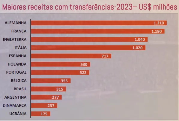 A França aparece com a segunda maior receita, enquanto Inglaterra e Itália fecham o Top-4 mundial entre os países com marca superior a US$ 1 bilhões.