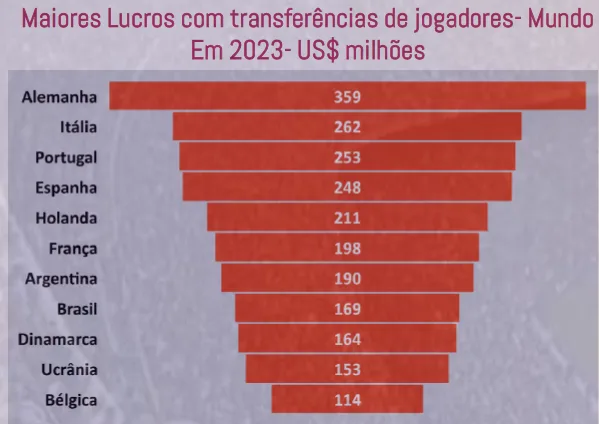 Além de liderar o total de receitas, a Alemanha também registrou o maior lucro com transferências de jogadores no mundo em 2023, com um total de US$ 359 milhões (R$ 1,6 bilhões).